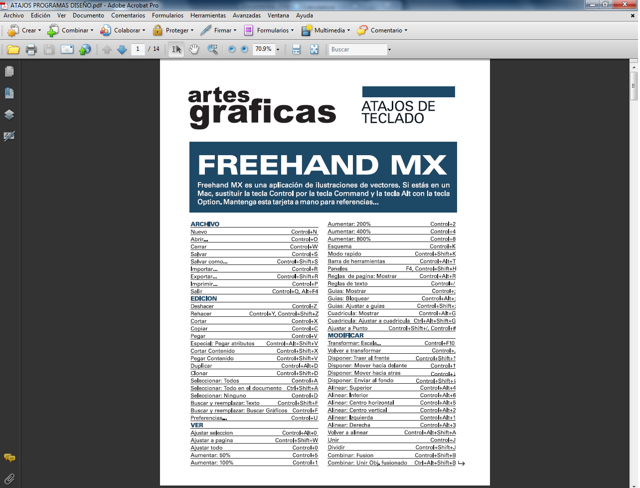 Buscando en internet me tope la necesidad de tener los atajos para utilizar programas tales como Freehand, Illustrator, CorelDraw, Photoshop , Indesign, Etc., encontré en un portal los comandos en pdf y tuve que hacer las traducciones de cada uno de ellos espero que les pueda servir de utilidad, para poder visualizarlo debe instalar el acrobat reader.